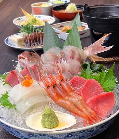 季節の先付け二種、お造り大漁盛り、ほたるいかと真鯛のしゃぶ、鱒西京焼き、和牛炙り焼き、白海老と芹のかき揚げ、炙り穴子の茶碗蒸し、氷見うどん、荒汁、デザート